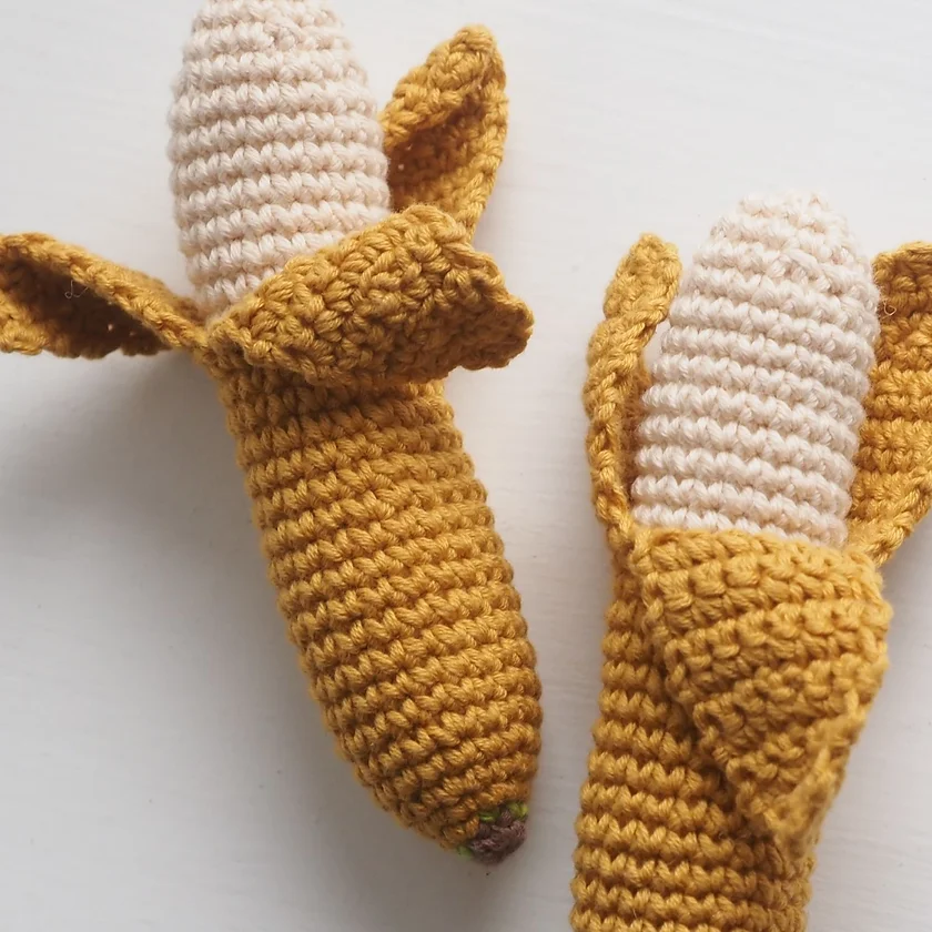 - Chocalho de Crochê em Forma de Banana: Divertido e seguro para estimular os sentidos do bebé. Com textura suave e som agradável, ele é perfeito para as mãozinhas pequenas explorarem.